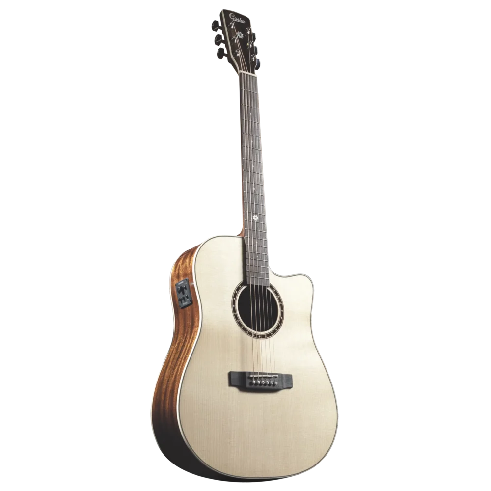 Featuring a solid spruce top and mahogany back and sides, it delivers a balanced, resonant tone with excellent projection. The cutaway design allows for easy access to higher frets, making it versatile for various playing styles.